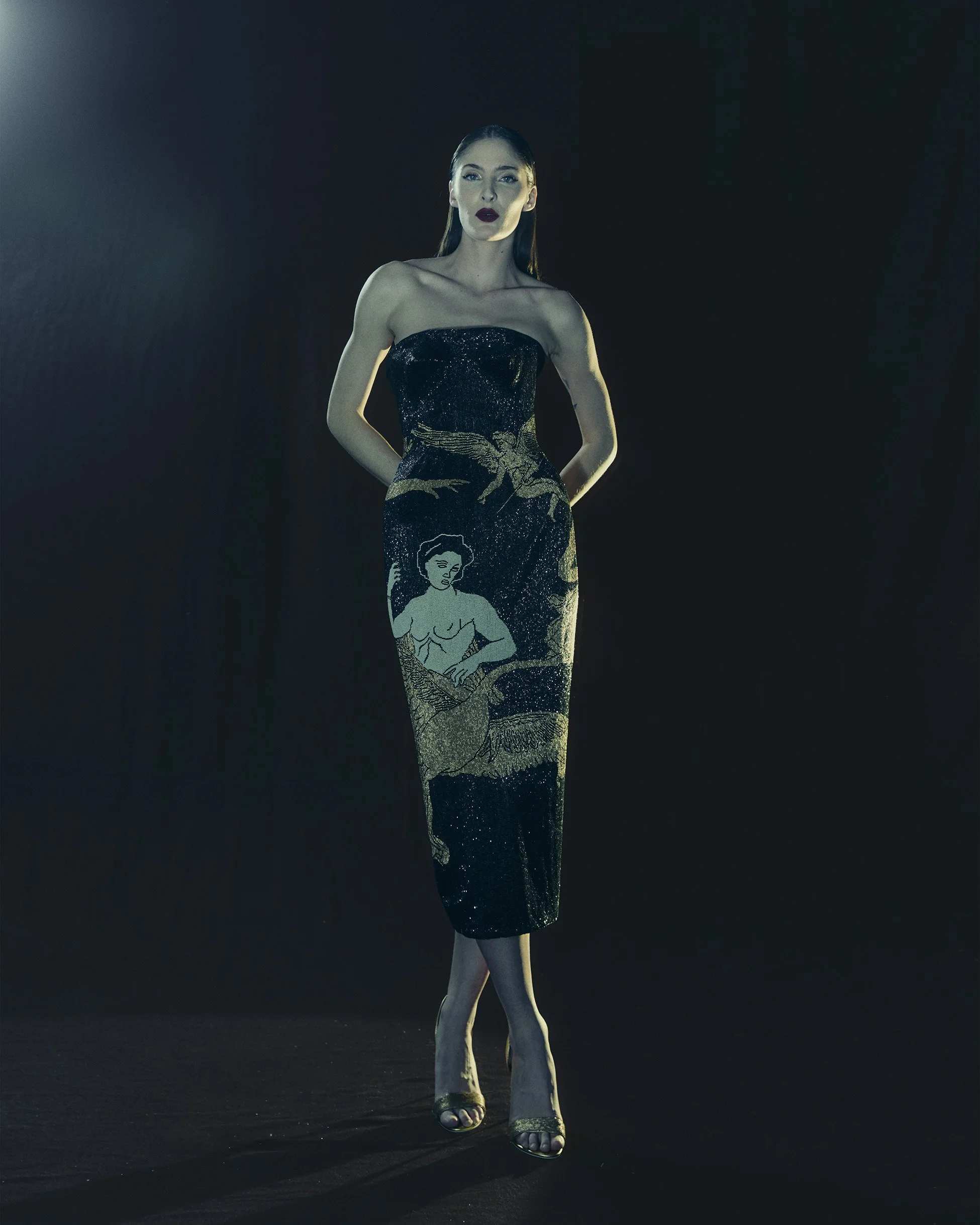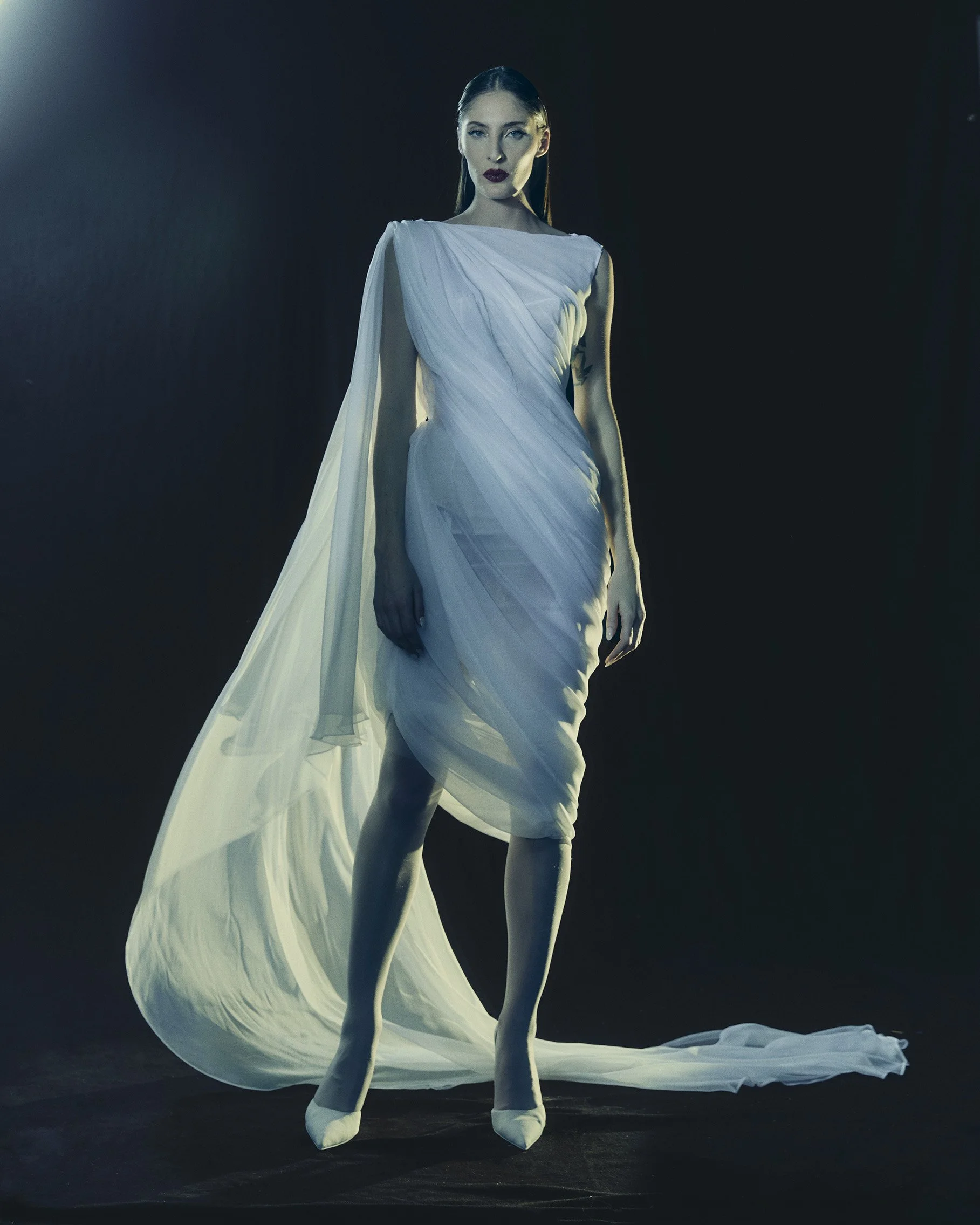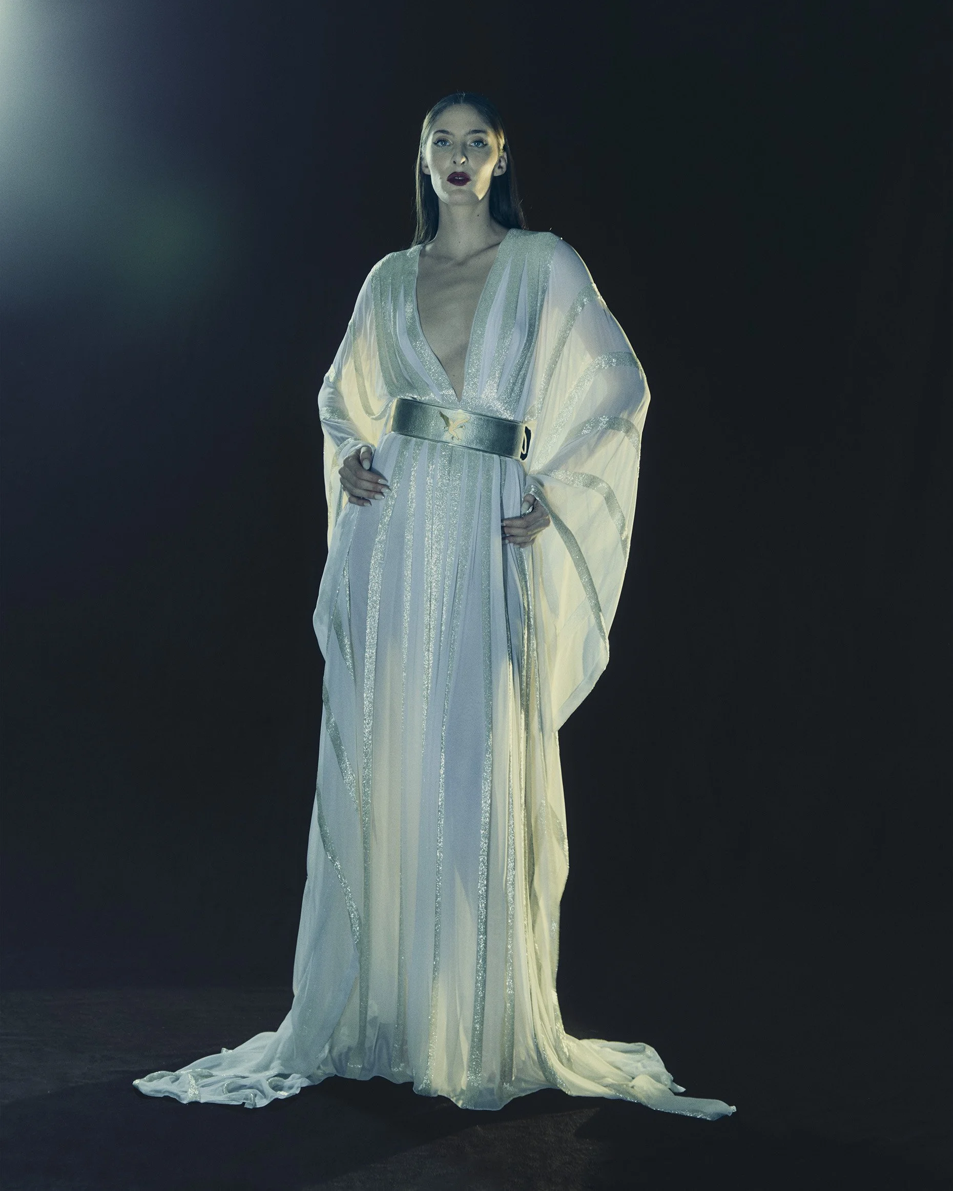 Presented as a cinematic narrative, “Goddess” bridges myth and modern couture, drawing from iconic films including Cleopatra (1963), Julius Caesar (1953), The Ten Commandments (1956), Land of the Pharaohs (1955), and The Egyptian (1954), with a nod to the era’s legendary costume makers such as Charles Le Maire. Draped gowns suggest Grecian divinity; architectural tailoring hints at Roman power; corsetry and sweeping capes deliver pure screen drama.