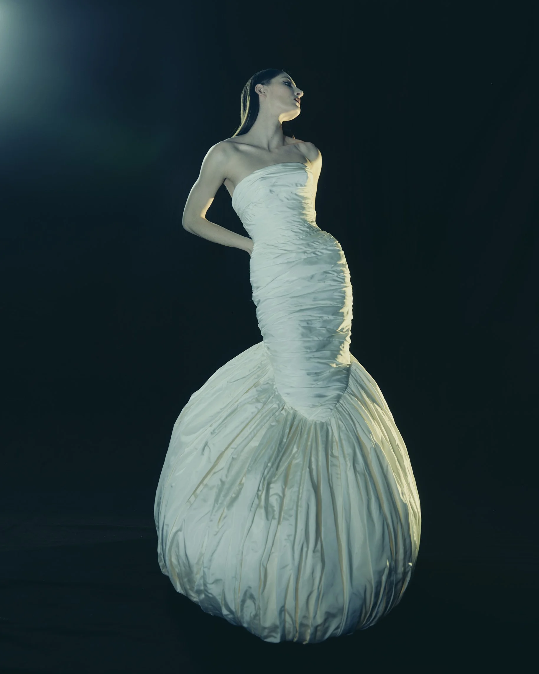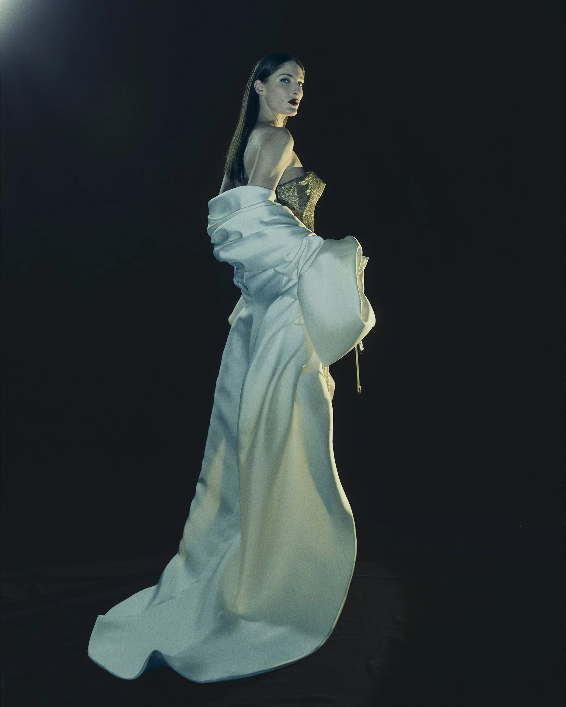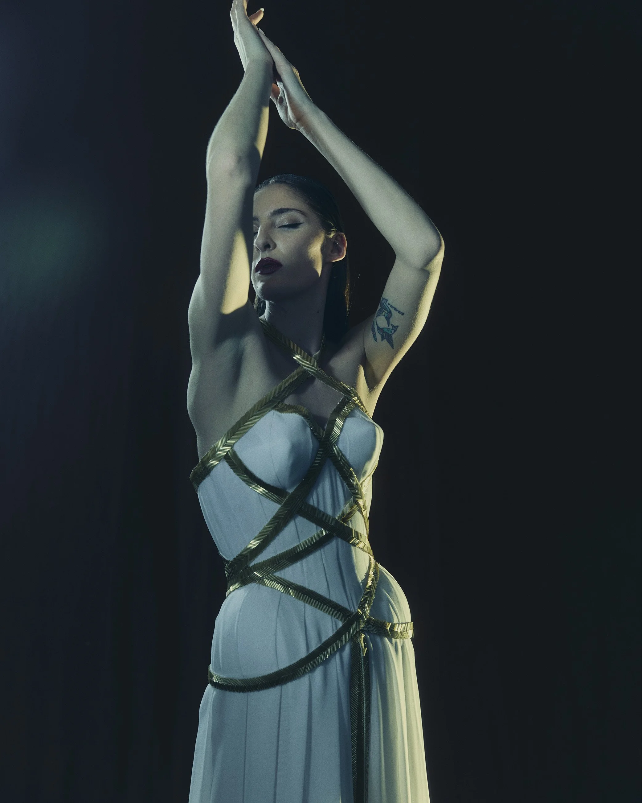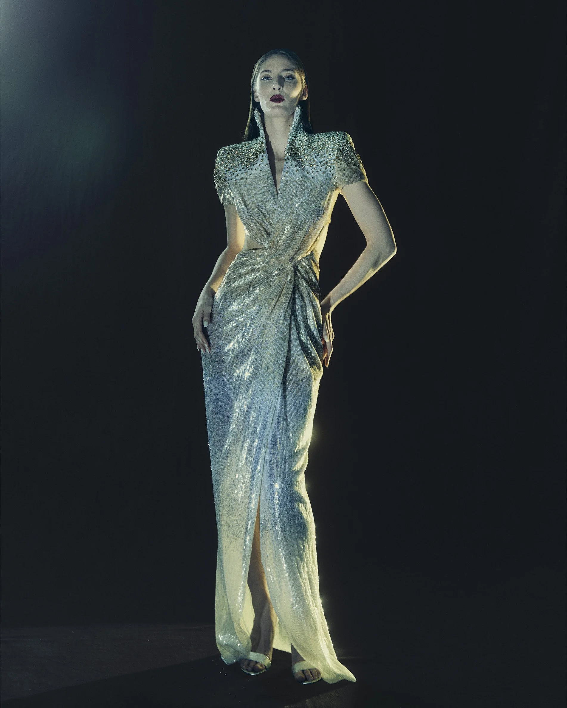 Presented as a cinematic narrative, “Goddess” bridges myth and modern couture, drawing from iconic films including Cleopatra (1963), Julius Caesar (1953), The Ten Commandments (1956), Land of the Pharaohs (1955), and The Egyptian (1954), with a nod to the era’s legendary costume makers such as Charles Le Maire. Draped gowns suggest Grecian divinity; architectural tailoring hints at Roman power; corsetry and sweeping capes deliver pure screen drama.